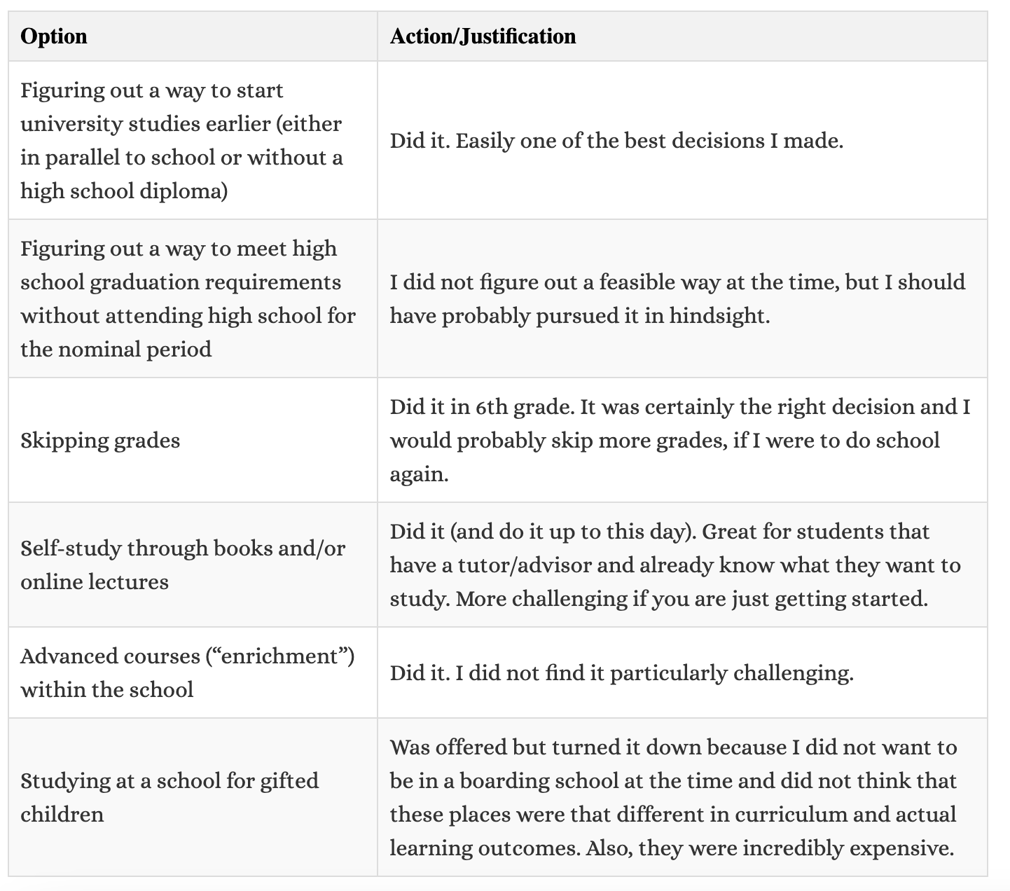 Please have a very low bar to reaching out to me at janniklschilling (at) gmail.com. I would be particularly interested in hearing from you, if your experience was fundamentally different or you have thoughts on gifted education in other regions or with different institutions.